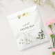 Custom-designed modern elegant wedding favour bag featuring sage green and white floral design with personalised name and text.