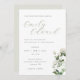Custom-designed wedding invitation card featuring delicate calligraphy with elegant sage greenery and white floral design.