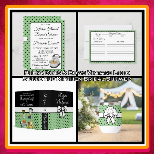 Personalised sage green and white polka dotted bridal shower party apron. Step back in time and host a bridal shower that's a delightful blast from the past with our Vintage Kitchen-Inspired Bridal Shower Collection. Embrace the charm of yesteryears as you celebrate the soon-to-be bride with a touch of nostalgia. From invitations that transport your guests to a bygone era to decor that transforms your space into a retro haven, every detail exudes vintage elegance and laughter. Share in the joy of a retro loving bride with personalised signs, favours, and activities that weave together the spirit of the past and the excitement of the future. This collection is a heartwarming blend of vintage aesthetics and modern celebration, ensuring an unforgettable bridal shower filled with cherished memories and laughter that echoes through the ages.