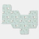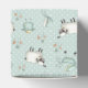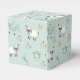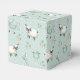A cute party favour box with sheep, baby carriage, bonnet, bird and flowers pattern in sage green on green and white polka dot background. Created with artwork by ©Trina Clark