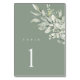 Sage green botanical wedding table number card designed for elegant reception tables.