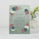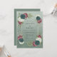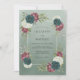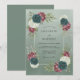 This design features a moody sage green palette adorned with rich botanical elements. Deep teal roses, burgundy peonies, and crisp white hydrangeas create a sophisticated atmosphere for a winter or autumn nuptial event. Lush greenery and delicate leaves surround the layout with an earthy, organic feel. The deep jewel tones contrast beautifully against the muted green background.