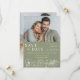 This Sage Green Elegant Floral Two Photo Wedding Save the Date Invitation showcases two of the couple's photos, with delicate line art flowers on a lush sage green background, complemented by contemporary typography and script calligraphy. It is fully customisable with the couple's names, wedding details, and photos of your choice. The formal design and wording will add a touch of elegance to your wedding celebration. The back photo has a white gradient at the bottom, so the couple's names will show up over any photo.