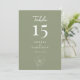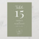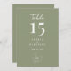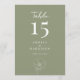 This Sage Green Elegant Floral Wedding Reception 5x7 Table Number showcases a large table number in white on a sage green background, with modern typography and script calligraphy, and a line art floral accent. It is fully customisable with the table number, couple's names, and wedding date.