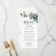An elegant sage green eucalyptus wedding menu featuring boho watercolor greenery and corner botanical designs with calligraphy script.
