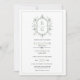Elegant sage green vintage floral crest monogram and border wedding invitation. Invite your guests with this charming wedding invitation featuring a sage green vintage floral design. A beautifully crafted crest showcases your personalised monogram along with your names in complementary green typography. A thin green border completes the elegant look. On the back, a QR code provides quick access to RSVP details and other essential wedding information.