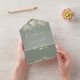 All in one wedding invitation featuring pretty string lights, botanical floral greenery, and elegant typography on a sage green background. The invitation includes a perforated RSVP card featuring a QR code. Designed by Thisisnotme©