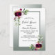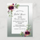 On front: Sage green gradient with a sage green and white frame. Decorated with flowers, roses in burgundy with greenery. Templates for the bride to be's names and party details. The name and Bridal Shower are written with a hand lettered style script, black coloured letters.