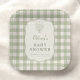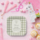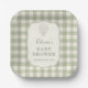 Baby shower party paper plates designed with a sage green gingham pattern for a soft, classic look. The design coordinates easily with gingham and floral baby shower themes while keeping table settings clean and cohesive. Suitable for baby showers, brunches, and dessert tables. Fully customizable text with a print-ready layout.