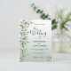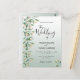On front: Botanical theme. Sage green gradient, ombre background. Decorated with greenery, sprigs and foliage with small golden flowers. Modern large hand lettered script, typography with the text: The wedding of. Templates for Your names and wedding details. Black text.