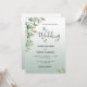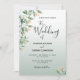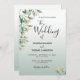 On front: Botanical theme. Sage green gradient, ombre background. Decorated with greenery, sprigs and foliage with small golden flowers. Modern large hand lettered script, typography with the text: The wedding of. Templates for Your names and wedding details. Black text.