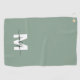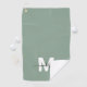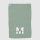 Create Your Own Personalised Custom Sage Green Modern Script Name Monogram Golf Towel. This chic, feminine golf towel features a stylish monogram design with a flat white initial on a soft sage green background and a classic black script name for a personalised touch. Printed on one side, this towel adds a unique and elegant flair to any golf bag. It makes a fun and sophisticated gift, perfect for birthdays, holidays, Mother’s Day, or any special occasion when you want to celebrate someone—or treat yourself! Ideal for the golf lover who enjoys a blend of style and personalisation while staying practical on the course.