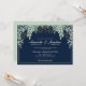 This dark blue wedding invitation features a beautiful graphic of sage green leaves that appears across the top of the invitation. The horizontal design offers accents of the colour gold.