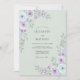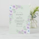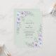 This design features a soft sage green background adorned with delicate watercolor blooms in shades of lavender and powder blue. Beautifully rendered roses and lush peonies create a romantic atmosphere, complemented by verdant foliage and sprigs of lilac. The painterly style evokes a serene springtime meadow, perfect for a refined and ethereal event.