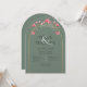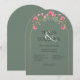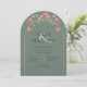 A gorgeous wedding invitation, arch shaped with a gold color arch frame on a sage green background.
