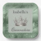 Sage green background framed with a green faux marbled metallic frame. Faux rhinestone jewelled silver tiara accent graphic. A perfect paper plate for all your Quinceañera guests. Perfect for your special day.