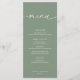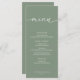 Modern, elegant menu features a sage green and white design. Personalise with your event's menu with the easy to edit template featuring an elegant script font and classy serif font.
