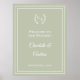 A sage green colored background. Decorated with a wreath and space for your monogram letters. White frames, wreath and text. Personalize and add your names and the wedding date.