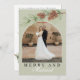 Merry & Married Sage Green Winter Pine Cone Greenery Botanical Photo Christmas Card - Celebrate your first Christmas as newlyweds with this elegant holiday card featuring a sage green background with white accents and festive pine greenery. The trendy arch-shaped photo frame highlights one cherished image—ideal for a wedding or engagement photo. Beautiful calligraphy adds a romantic touch, and the back includes an editable message area for personalized greetings. A stylish way to share winter wishes and mark your "First Christmas as Mr. & Mrs."