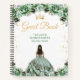 This elegant and glamourous Quinceañera guest book features a beautiful princess with dark hair in a sage green ball gown. The text combines handwritten script and modern sans serif fonts for a classy and sophisticated look. The floral arrangements and gold confetti create the perfect blend of rustic and chic.