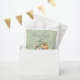 This sweet baby shower thank-you favour bag features a watercolor image of two pumpkins in pastel shades of sage green and orange, adorned with white and orange flowers, on a sage green background. Above, the words "thank you" appear in elegant charcoal grey handwriting script. Personalise the text with the name of the mum-to-be and the date in charcoal grey sans serif font. Ideal for a gender-neutral fall baby shower.