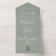 All in one wedding invitation featuring elegant signature script name and monogram initials on a sage green background. The invitation includes a perforated RSVP card with your wedding website QR code. Designed by Thisisnotme©