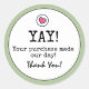 If you’re looking for a colourful, perhaps unique and sweet way to thank customers for their purchase, you might appreciate this fun retro inspired Sage Green “Yay! Your purchase made our day!” (With Heart) Business Thank You Classic Round Sticker from Zazzle! Available in small sheets of 20 and large sheets of 6 in glossy or matte finish. Sold by the sheet or in quantities of 2-500 (sheets). Buy them as is or easily customise the text on the front to meet your gifting needs. Perfect to add to envelopes, packaging, gift bags and more! Save when you buy more - no minimums. 100% satisfaction guaranteed.