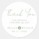 This round sticker for your wedding is designed with an elegant monochrome theme, featuring sage green script calligraphy that spells out the phrase "Thank You." The sticker also includes space for you to personalise it with your names, adding a special touch to your wedding favours or thank you cards.