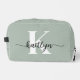 This simple, elegant sage green toiletry bag with your first name in a trendy script font in black and your first initial in a modern cap font in white is perfect for you. It's stylish and trendy and yet very classic. It will be fabulous for school, the gym, work, your car - will make keeping your makeup or toiletries all in one place when you're away from home.