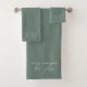 A beautiful sage green design incorporating signature script font typography. A classy and stylish bathroom towel set design ideal for anyone. Customise the gold monogram text and script typography bathroom towel set and make it your own!