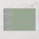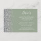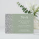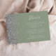 The left-hand edge of this elegant modern wedding details enclosure card features a silver faux glitter design. The customisable text combines white handwriting, copperplate and italic fonts on a sage green background. The reverse side features a matching sage green and silver glitter design.