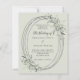 A sage green background. An oval faux silver frame decorated with sage green greenery. Personalise and add your names, details. Black text.