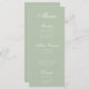 A simple menu that has a modern colour, sage green, and uses elegant calligraphic script for title and subtitles. All text is white.