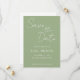 Simple style wedding save-the-date invitations that feature white, stylised script on a trendy, sage green colour background. Edit and replace names, date, and location with your own. Select your invitation size and paper style.