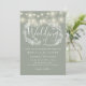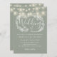 A sage green wedding invitation featuring pretty string lights and a delicate hand-drawn rustic floral garland of botanical leaf foliage with stylish script typography. Personalise with your special wedding day information. Designed by Thisisnotme©