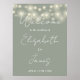 This sage green string lights elegant script wedding welcome sign can be personalised with your information in chic typography. Designed by Thisisnotme©