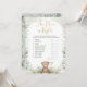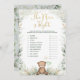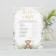 This elegant baby shower game features a cute teddy bear holding a heart-shaped balloon framed with a beautiful watercolor greenery wreath