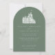 Impress your guests with this elegant formal wedding invitation by JessicaAmber. This arched card features a detailed vintage illustration of a castle, which you can replace with an image of your destination wedding venue. Elegant white lettering displays the bride and groom names, and details of the wedding, including the location, date and time, on a sage green background. This invitation is preferred for when the couple are hosting the event themselves.