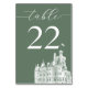 These wedding table numbers feature a vintage illustration of a castle, which you can replace with an image of your destination wedding venue. Elegant white lettering lays out the table number on a sage green background. The text is fully editable, so you can make as many table numbers as you want! Simply click 'Personalise this template', change the number, and add to cart. Repeat for each card.