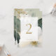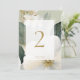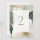 Chic and elegant. This gorgeous wedding table number features a lovely watercolor floral bouquet with imitation gold accents. included is a contemporary font in imitation gold set inside a soft white overlay with thin white frame, against a sage green background. The design is repeated at the back.