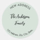 We have moved, return address sticker. Personalise and add your family name, your new address. Curved text. Sage green background, black text.