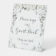 Watercolor painted white peonies and silver eucalyptus greenery vines with a grey script with your names and wedding date asking your guests to sign your guest book.