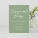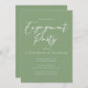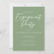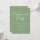 This simple solid sage green engagement party invitation features elegant white typography for an outdoor ceremony in a nature setting. Minimalist script on a peaceful light green invite for a rustic venue outside near a forest of trees.