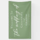 This simple solid sage green wedding banner features elegant white script for an outdoor ceremony in a nature setting. Minimalist typography on peaceful light green decor for a rustic venue outside near a forest of trees.