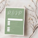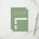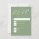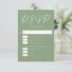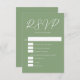 This simple solid sage green wedding RSVP card features elegant white script for an outdoor ceremony in a nature setting. Minimalist typography on a peaceful light green response card with meal choices for a rustic venue outside near a forest of trees.