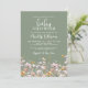 Muted Pastel Boho Botanical Garden Baby Shower Invitation. Celebrate the mom-to-be with this elegant boho design featuring a sage green background on both the front and back for a calm, earthy, and timeless look that works beautifully from spring through autumn. At the top, “Baby Shower” is displayed in a refined mix of script and serif typography in crisp white for an elegant yet modern feel.