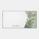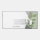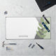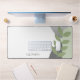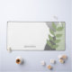 This desk mat features a geometric print with plant leaves, an arch and circles in shades of sage green and grey on a white background. Easily change or remove the featured text by clicking "Personalise this Template".