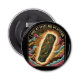 Very cute and compact little bottle opener. Also very fond of the magnet, both for sticking to the fridge and holding on to the bottle cap when trying to open it. Good quality print. As pictured.