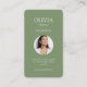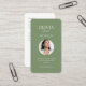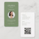 Modern and stylish business card featuring a QR code for social media, photo, tagline, enquiry details and social media links. This versatile all-in-one-template can easily be updated. Replace circle photo with own profile photo or company logo. Your image will be adjusted automatically to fit into a circle shape. The design has a fresh & chic look and feel. This template comes in white and olive green.