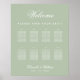 A simple seating chart with 8 tables, for a wedding with sage wedding color. The background is sage green, the text is white. The word Welcome in the upper part and the names of the bride and groom are written in an elegant calligraphic script, the rest in caps.